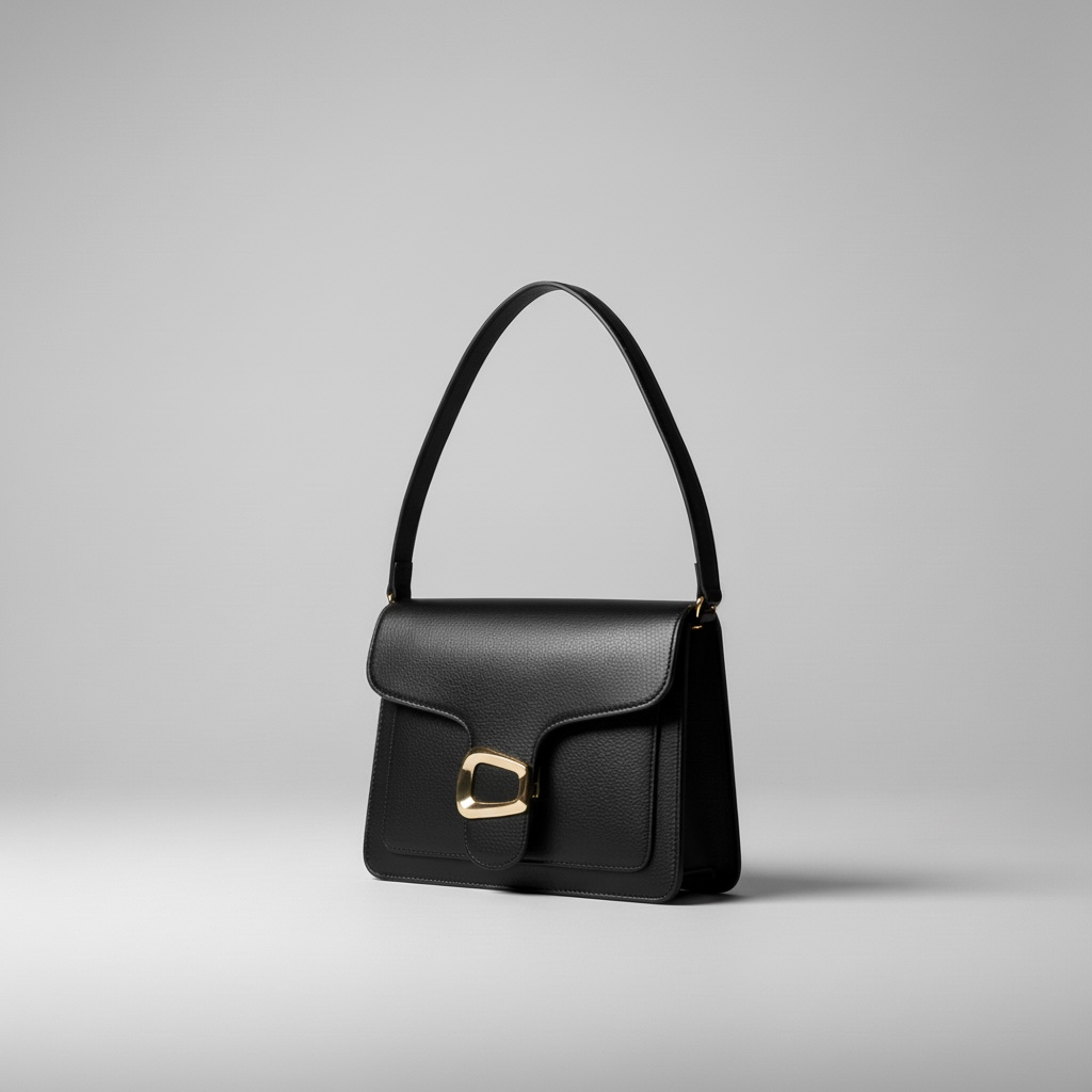 A statement in refined minimalism, this black shoulder bag is crafted in a rich pebbled texture that exudes quiet luxury. The structured silhouette is elevated by a bold, sculptural metallic clasp—designed to catch the eye while maintaining an elegant, modern aesthetic.